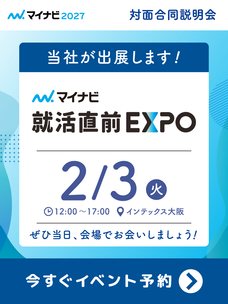 イベント 【イベント出展情報】2027年卒向け「2月3日 就活直前EXPO 大阪会場」へ出展します! 2026.01.08 開催日:2026年2月3日(火) 会場:インテックス大阪(大阪府大阪市住之江区南港北1-5-102) 交通:コスモスクエア駅より徒歩9分/トレードセンター前駅より徒歩8分/中ふ頭駅より徒歩5分 開催時間:12:00〜17:00 出展エリア:インターンシップ&キャリア発見エリア 詳細はこちら!→https://job.mynavi.jp/conts/event/2027/10251/index.html