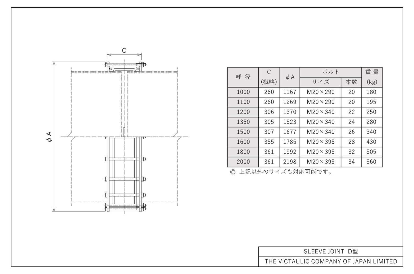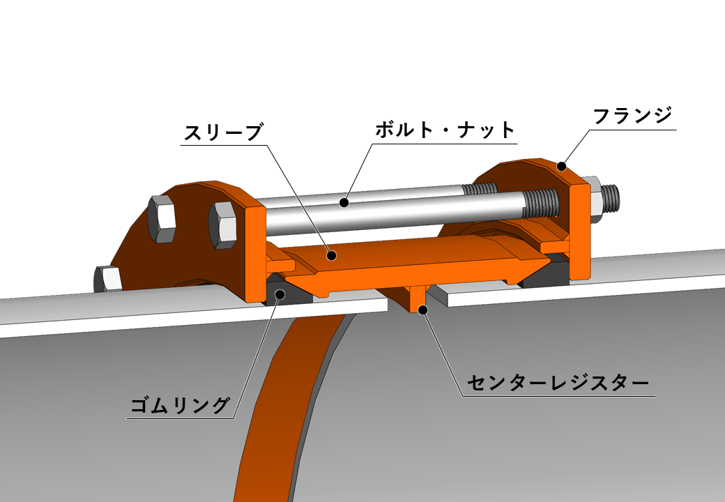 無頭管用に管をそのまま差し込んで接合できる簡易な鋼製の伸縮継手です。1個のスリーブと2個よりなるフランジ及びゴムリングと数本のボルトナットより構成されており、スリーブの両端にゴムリングを置きそれぞれを押えるようにしてフランジがこれらの外側より長いボルトで締結されております。センターレジスター付のため配管の偏りが防止されます。