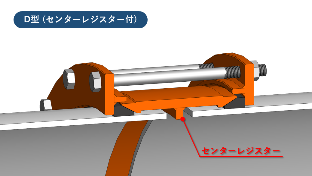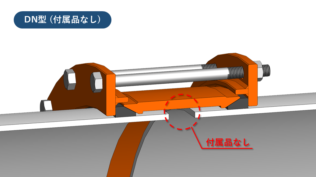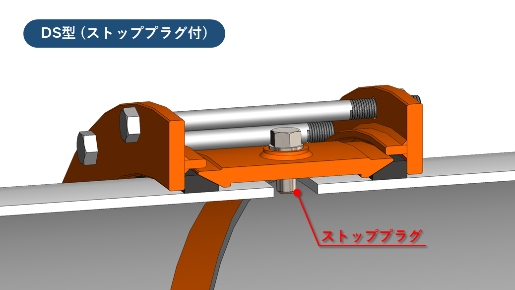 円周上のボルト・ナットを締め込むことで、左右のフランジがゴムリングを内側に押し付けます。押し付けられたゴムリングは、スリーブ端および管外面に押し当てられ密着し、止水される機構となっております。ストッパーはプラグ式(DS型)と溶接式(D型)の2種類が選択できます。
