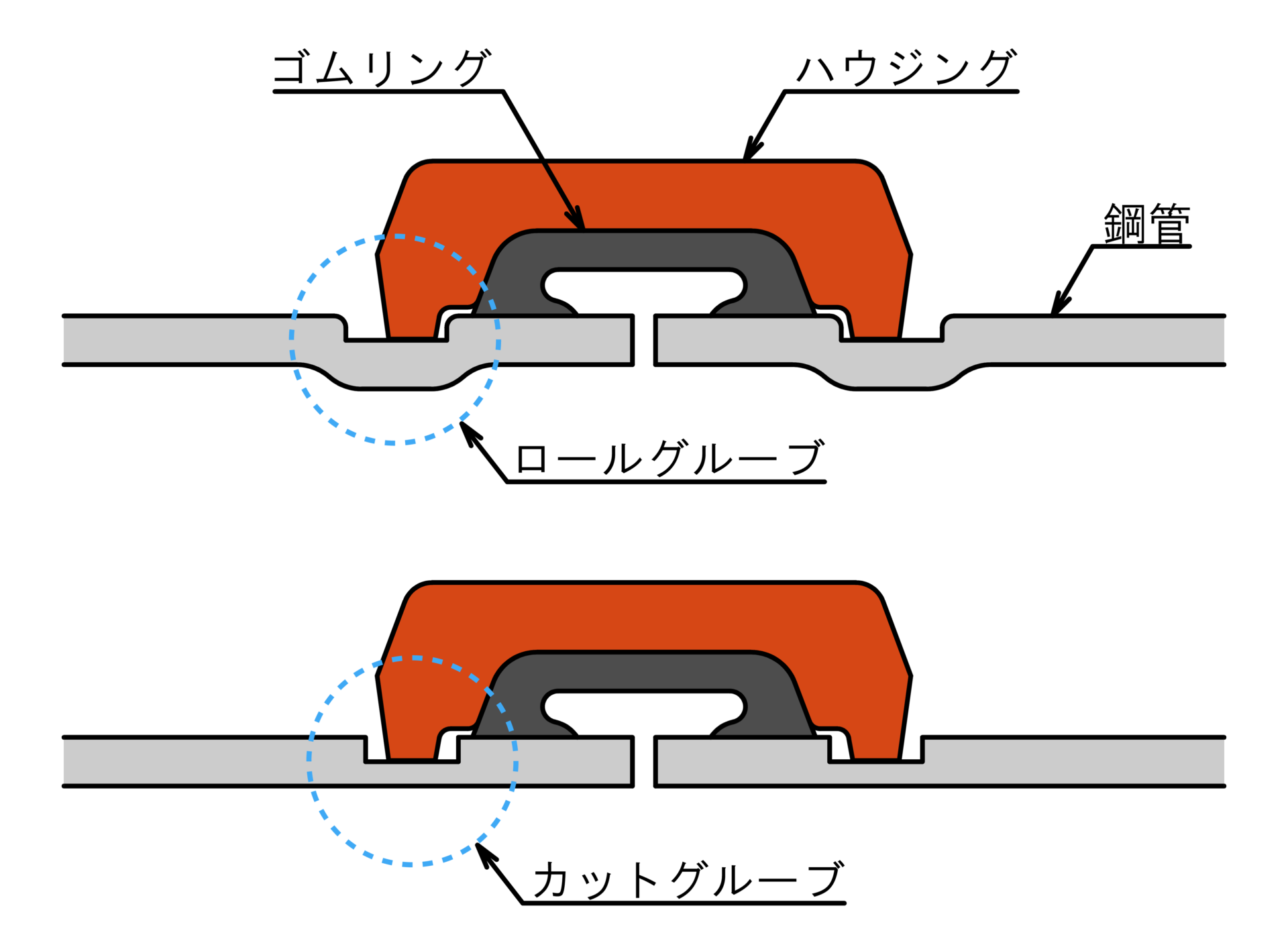 グルーブ形式のヴィクトリックジョイントです。取り付け後に若干の可動性能を有しており、溝加工には転造(ロールグルーブ)、切削(カットグルーブ)があります。加工に火気を使用せず、ボルト2本を締め込むことで施工完了するため、安全・安価な接続方法です。日本消防設備安全センター登録品です。