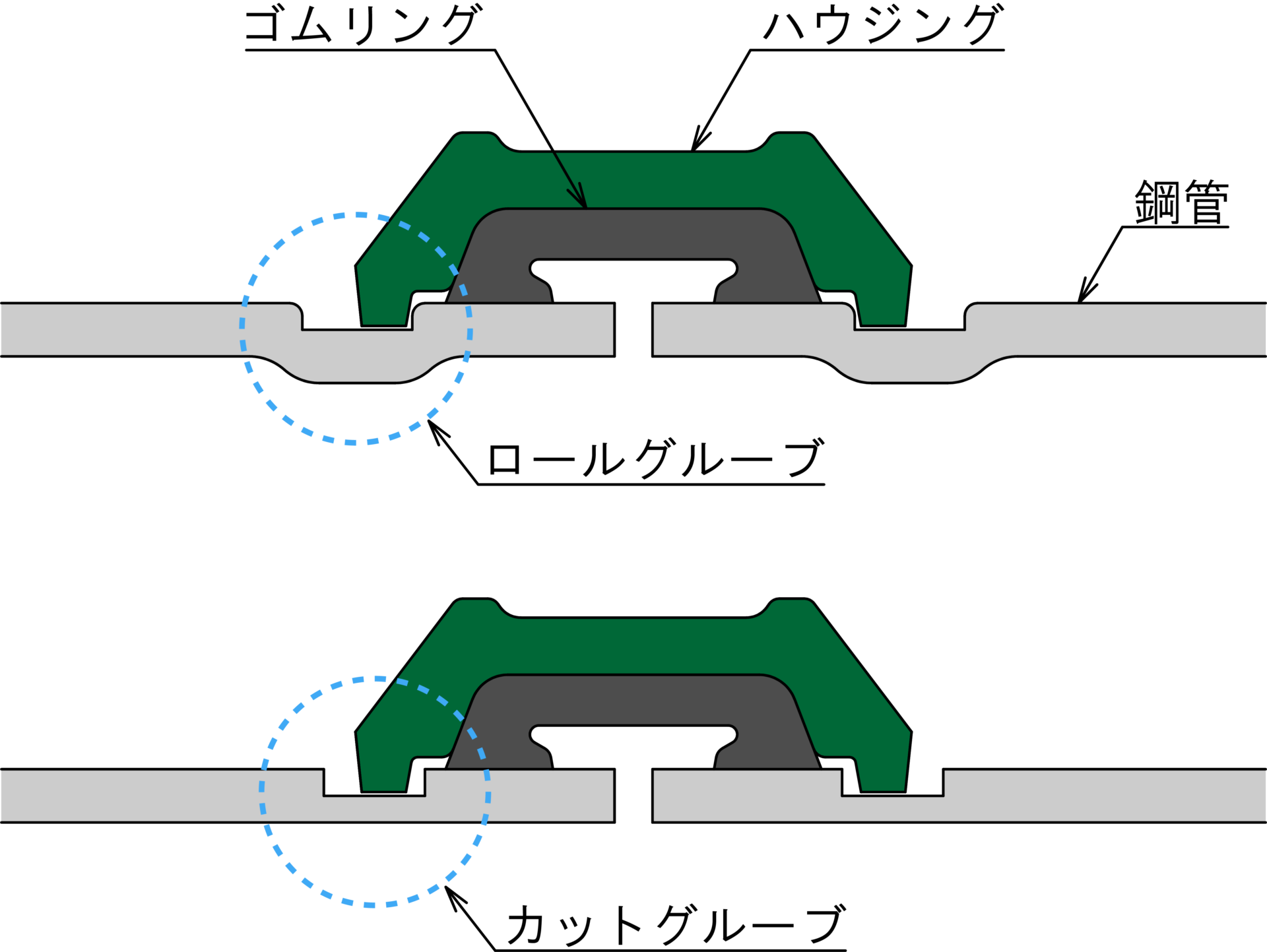 グルーブ形式のヴィクトリックジョイントです。取り付け後に若干の可動性能を有しており、溝加工には転造(ロールグルーブ)、切削(カットグルーブ)があります。加工に火気を使用せず、ボルト2本を締め込むことで施工完了するため、施工が容易且つ安全・安価な接続方法です。